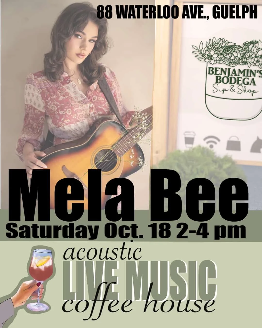 SHOW DATES Oct 18 Benjamin's Bodega Saturday, October 18, 2025 2:00 p.m. 4:00 p.m. Guelph, ON Canada (map) Google Calendar ICS Solo Acoustic Performance in Guelph, ON. View Event → Oct 22 Musician's Corner @ Stone Road Mall Wednesday, October 22, 2025 5:00 p.m. 7:00 p.m. Guelph, ON (map) Google Calendar ICS View Event → Oct 24 Handsome Devil's Bistro Friday, October 24, 2025 8:30 p.m. 11:00 p.m. Elora, ON. (map) Google Calendar ICS Mela Bee with Rick St. Clair and Jaime Junger $10 at the door View Event → Nov 28 to Nov 29 Which Craft Fri, Nov 28, 2025 9:30 p.m. Sat, Nov 29, 2025 1:00 a.m. Guelph, ON (map) Google Calendar ICS Mela Bee live at Which Craft View Event →